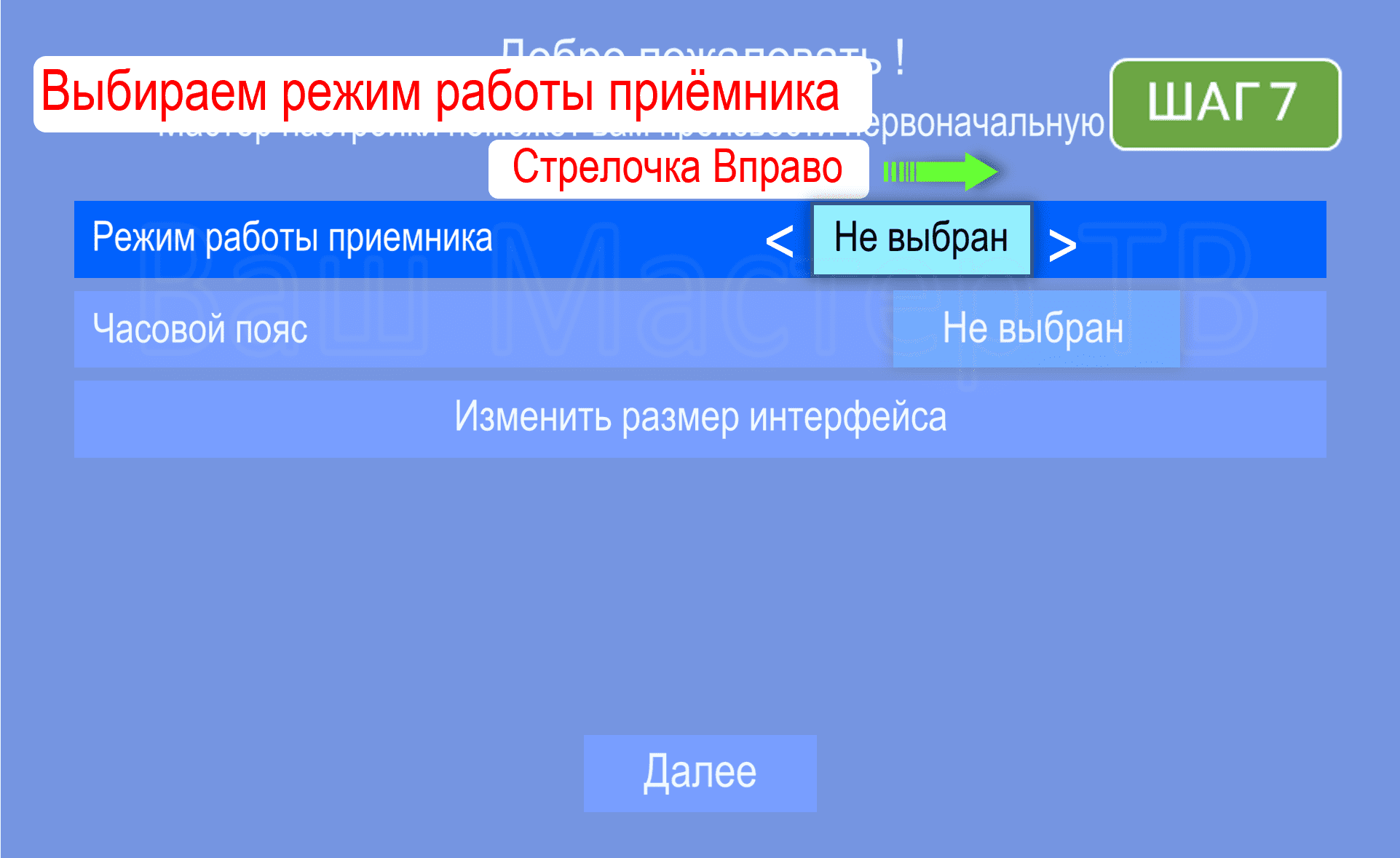 Шаг 8 ➠ На этом шаге необходимо выбрать часовой пояс. Нажимаем стрелочку вправо — откроется пункт «МОСКОВСКОЕ ВРЕМЯ (МСК+0)», далее нажимаем стрелочку вниз 2 раза, чтобы подсветить «ДАЛЕЕ». Нажимаем «ОК» на пульте.