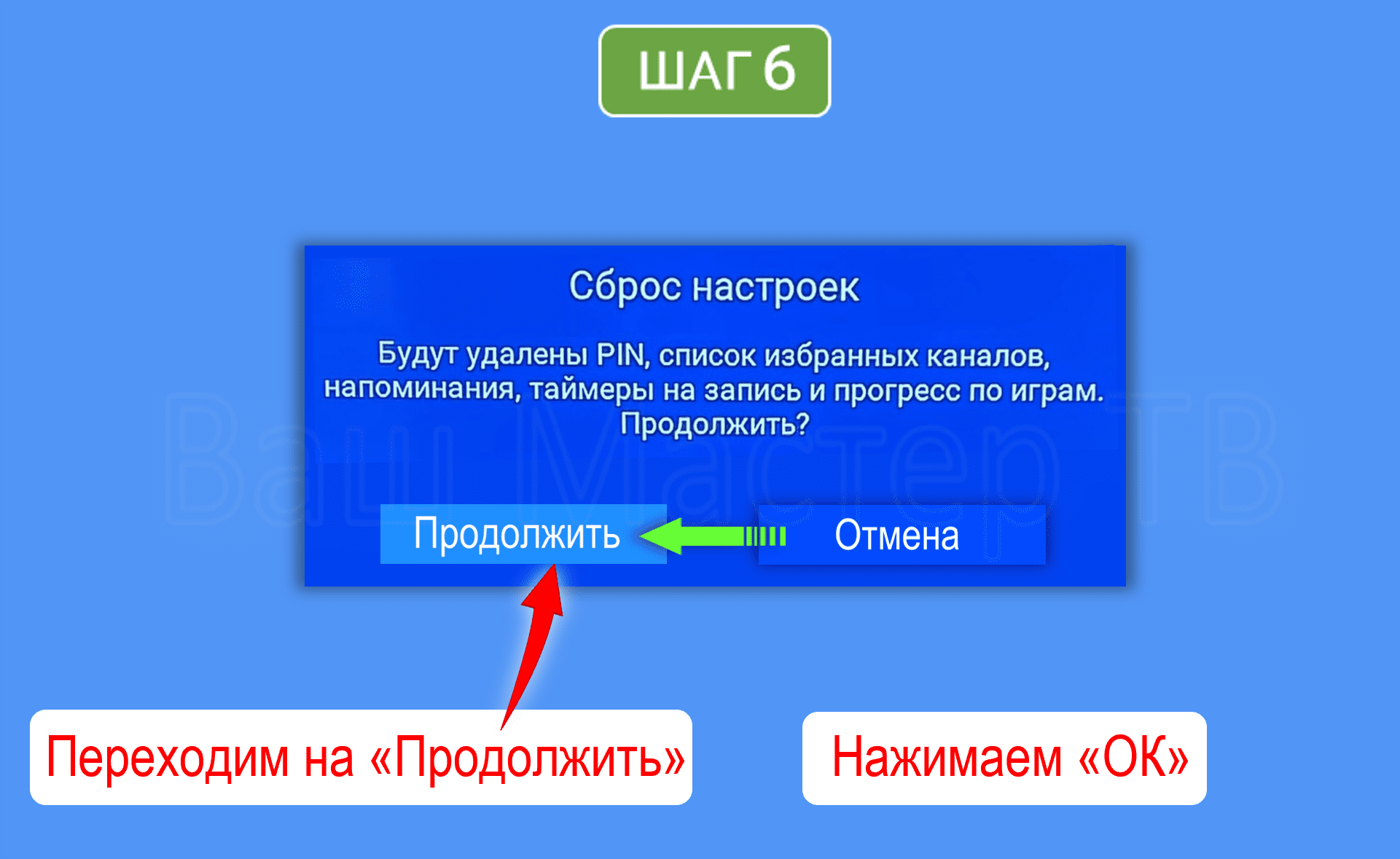Шаг 6 ➠ Система попросит подтвердить сброс настроек. По умолчанию голубой цвет будет на кнопке «ОТМЕНА». Переходим на «ПРОДОЛЖИТЬ» (стрелочка влево). Нажимаем «ОК».