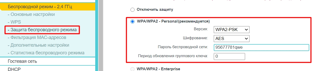 Частота беспроводного режима – 2,4 ГГц. WPA идет по умолчанию. Установленный режим – смешанный 11bgn. Ширина канала – 20 МГц.