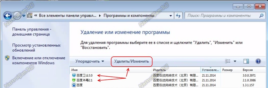 Первым шагом нужно удалить зайти в «Панель управления Windows» ->»Программы и компоненты»->»Удаление или изменение программ». Здесь находятся 2 или 3 программы с названием и описанием на китайском языке — 2 версии антивируса и Baidu PC Faster.