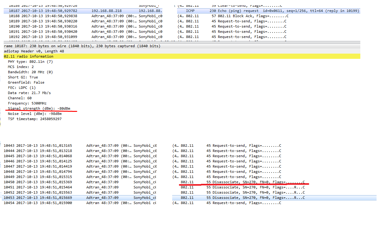 Отыскать следы работы 802.11v не получилось – для активации работы балансировки необходимо хорошо нагрузить точку, и ждать что произойдёт в эфире, в этот раз не удалось этого сделать. Bluesocket заявляет адаптивную систему балансировки, которая всегда позволяет подключиться клиенту к желаемому радио, а дальше уже при необходимости его переключает. Нет смысла выдавливать всех по умолчанию в 5 ГГц, когда 2,4 пуст, также у клиента не всегда достаточный уровень сигнала для использования пятёрки, а ему мешают подключиться к двойке. По опыту, балансировка работает, но вот поймать её работу в дамп полностью я пока не сумел – в этот раз попались только сообщения Disassociate после падения сигнала и отсутствия ответа от клиента, но клиент в это время уже переподключился самостоятельно. Свежие аппараты, как мой Xperia Z5, сразу подключаются в 5 ГГц, аналогично поступают все новые устройства Apple. Ограничился проверкой предоставления соседей, и дампом роуминга на двух каналах одновременно. В процессе разбора переключения увидел достаточно интересное – задержку передачи определенных пакетов устройством, когда канал уже установлен и работает, но трафика приложения долгое время нет. Так что при реальном тестировании определенного приложения необходимо учитывать особенности работы его и сетевого стека вашего устройства – вполне возможно, что в задержке виноват не WiFi, а ваш софт!