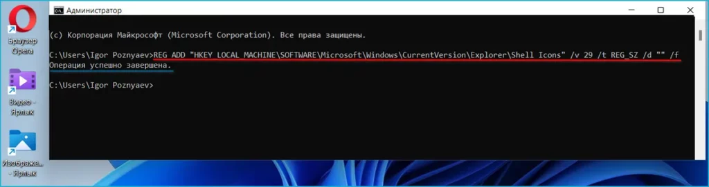 Затем перезагрузите компьютер или перезапустите Проводник. Стрелки с ярлыков исчезли. Помните, что данный метод также вносит изменения в реестр Windows 11, но без обращения к графической утилите — редактору реестра. Быстрее, но менее наглядно.