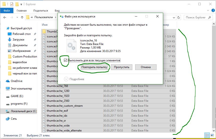Вы можете получить сообщение об ошибке которое говорит вам, что файл используется и не может быть удален. Просто установите флажок “сделать это действие для всех текущих объектов” и нажмите на кнопку “попробовать снова”.