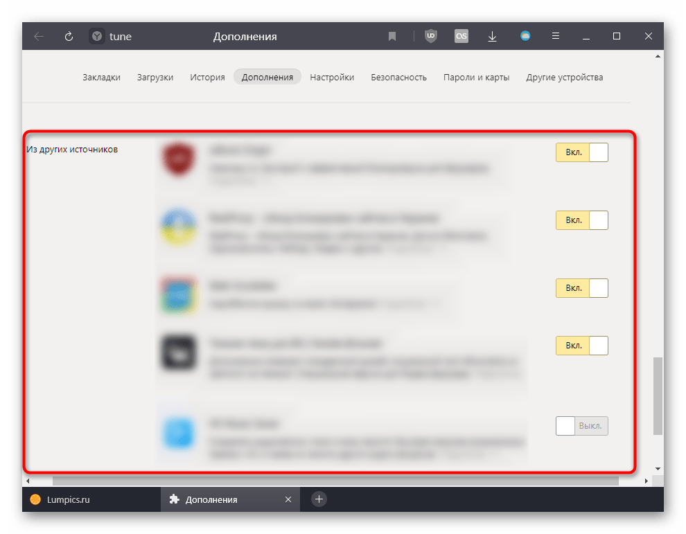 Чтобы избежать подобных проблем, вы могли бы просто удалить ненужные расширения. Но на самом делать это вовсе не обязательно: просто зайдите в Меню → Настройки → Функционал и расширения и снимите галочки с ненужных расширений.