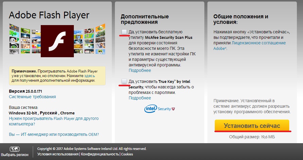 Для того чтобы установить Adobe Flash Player нужно перейти на сайт https://get.adobe.com/ru/flashplayer/. Не забываем снять галочки со второго пункта под название Дополнительные приложения иначе на ваш компьютер установиться бесполезный антивирус и т.д. Далее кликаем Установить Сейчас.