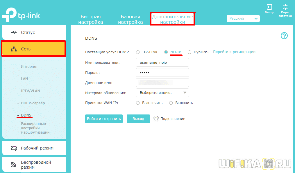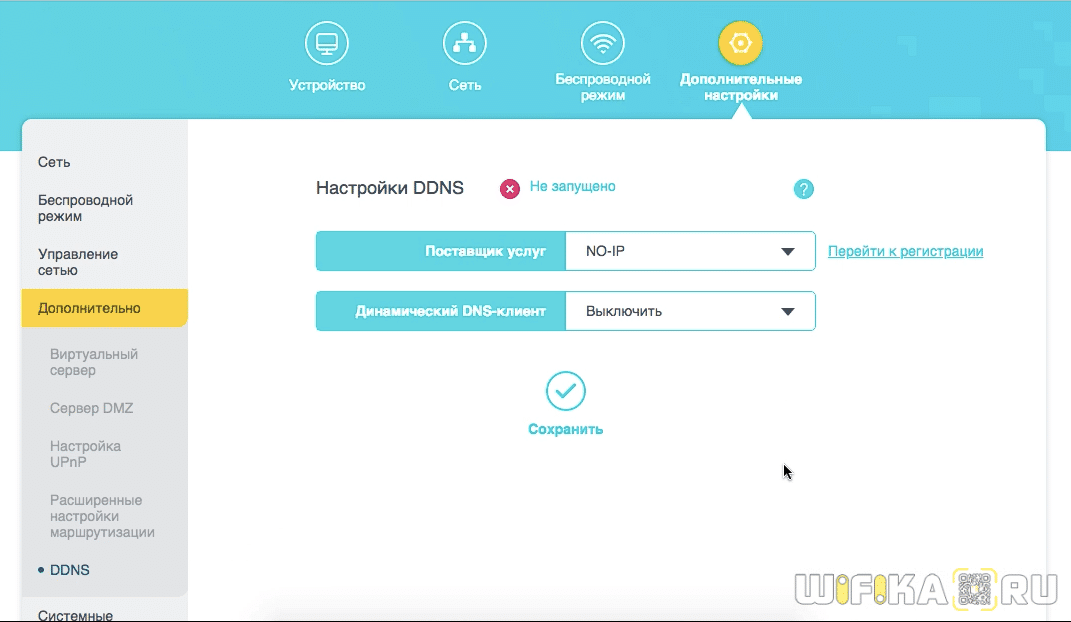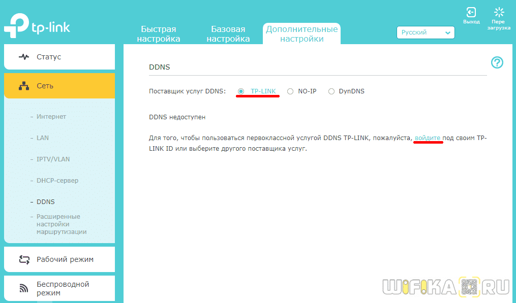 У более дорогих моделей все еще более интересно — совсем недавно TP-Link внедрил облачные технологии, с помощью которых можно заменить DDNS — теперь все настраивается еще проще. Идем во вкладку «Дополнительные настройки», раздел «Сеть — DDNS». Тут можно также использовать существующую учетную запись в no-ip.com