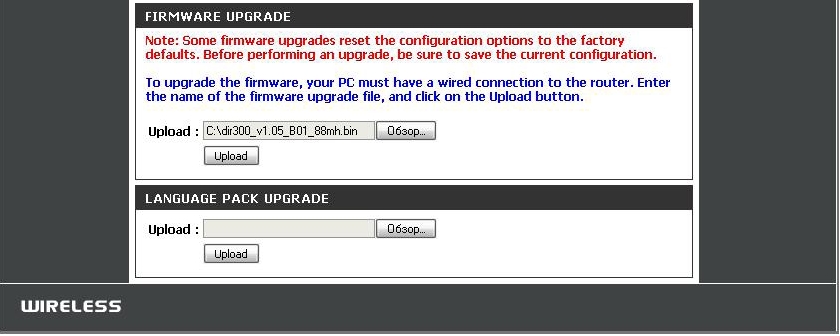 - Выбрать файл с нужной версией прошивки кнопкой «Обзор» и нажать кнопку «Upload» («Загрузить»).