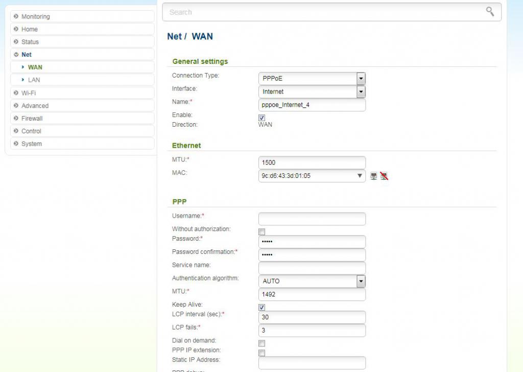 После смены логина и пароля на экране появится интерфейс, в котором будут указаны все параметры подключения, включая все возможные параметры настроек по технологии провайдера.