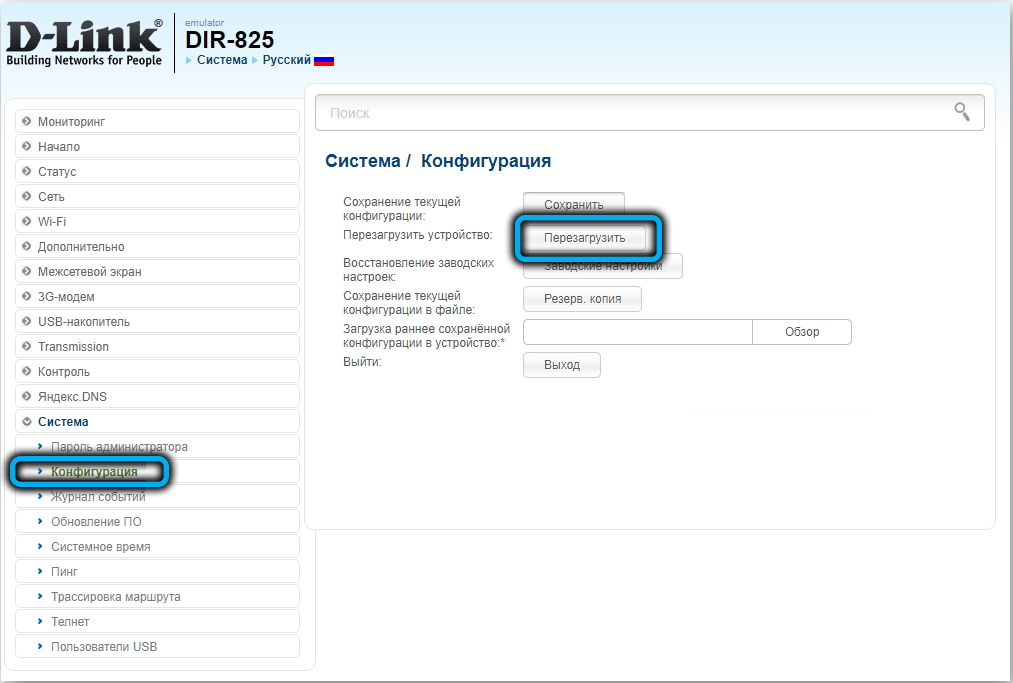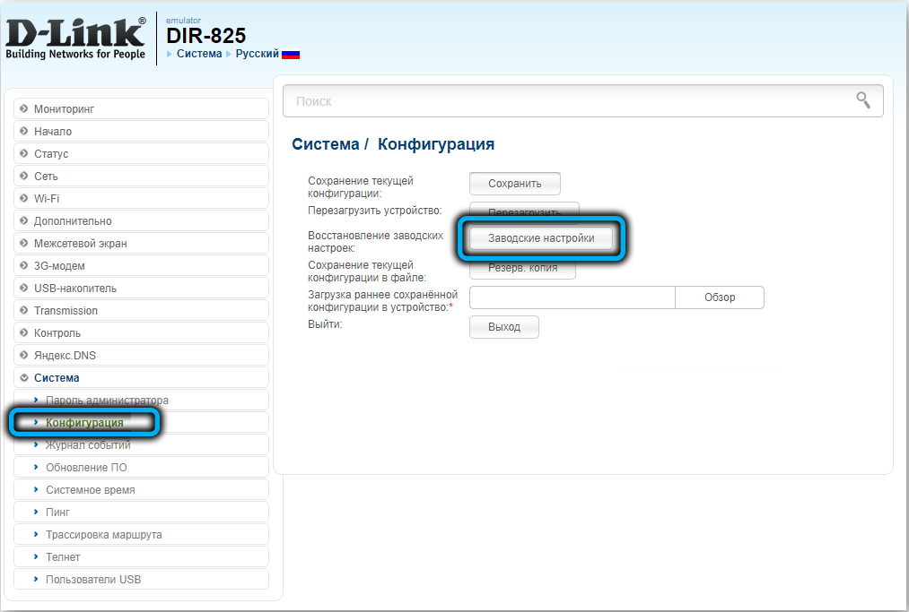 В остальных случаях намного проще выполнить сброс настроек D-Link DIR-825 до заводских через веб-интерфейс, для чего нужно войти во вкладку «Система», выбрать подпункт «Конфигурация» и кликнуть по кнопке «Заводские настройки». Можно также сохранить текущие настройки, нажав соответствующую кнопку, чтобы при необходимости иметь возможность вернуться к исходному состоянию.