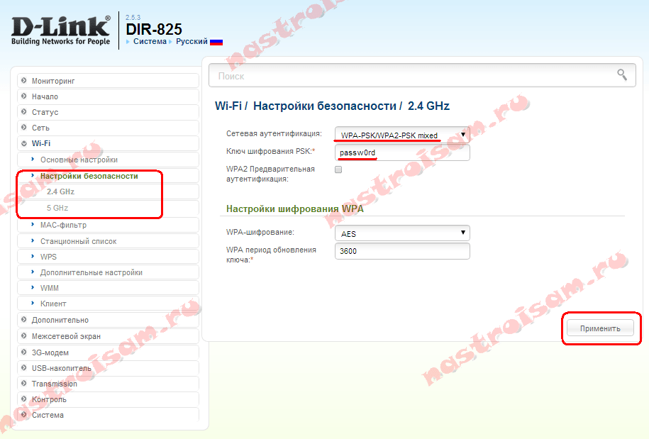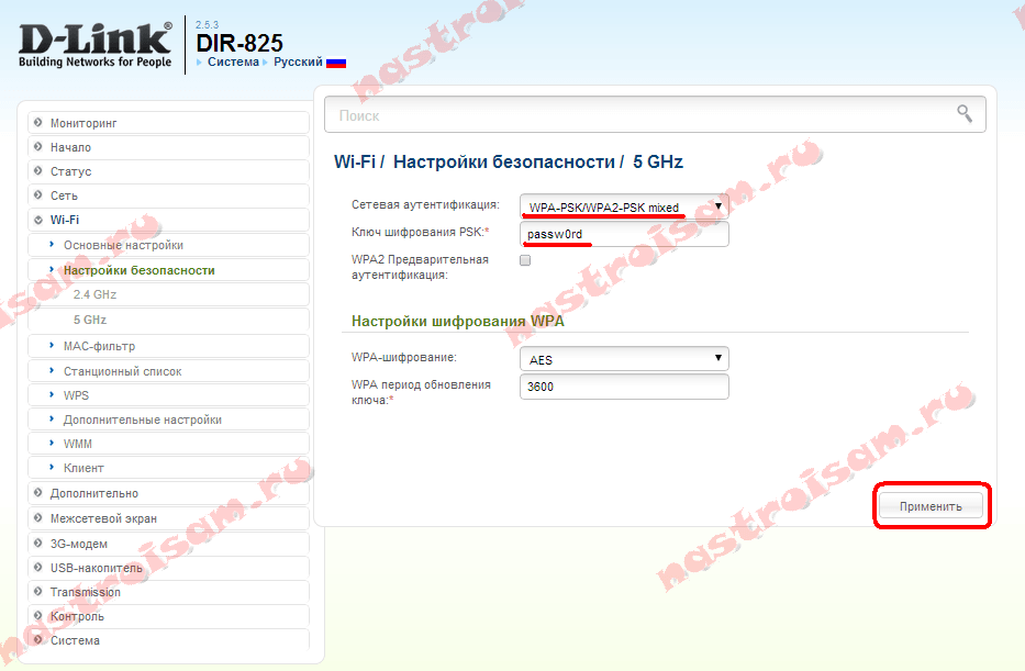 Тип шифрования меняется в списке «Сетевая аутентификация», Пароль прописывается в поле «Ключ шифрования PSK». Для диапазона 5ГГц эти же параметры можно изменить в подразделе «5 GHz»: