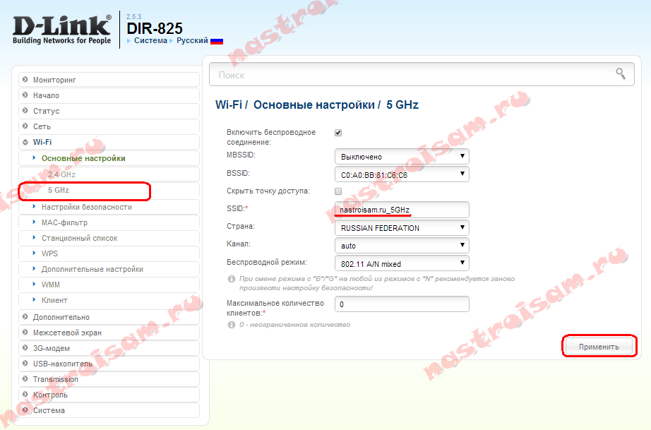 В подразделе «Основная настройка» => «2,4 GHz» можно изменить параметры обычной сети Вай-Фай — поменять её имя (SSID), Канал или Беспроводной режим. Для 5ГГц, вам нужно зайти в подраздел «5 GHz»: