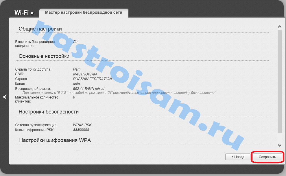 Конфигурирование точки доступа DAP-1360 D1 завершено. Сверяем ещё раз опции и жмем кнопку Сохранить.
