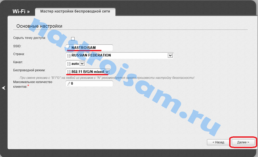 Теперь Вам надо снять галочку «Скрыть точку доступа». Затем в поле «SSID» прописать идентификатор создаваемой беспроводной сети. Им может быть любое слово в английской раскладке, либо число. В списке Беспроводной режим выбираем «802.11 B/G/N mixed». Нажимаем кнопку «Далее».