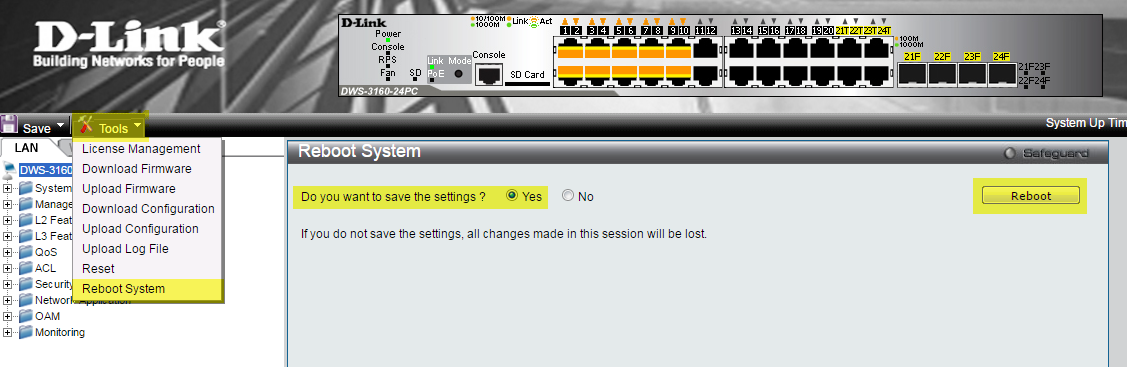 Перезагружаем коммутатор Tools — Reboot System, отмечаем пункт Yes в вопросе о сохранении настроек и нажимаем Reboot.