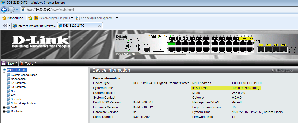 Настройка IP адреса на коммутаторе DES-3200 С1