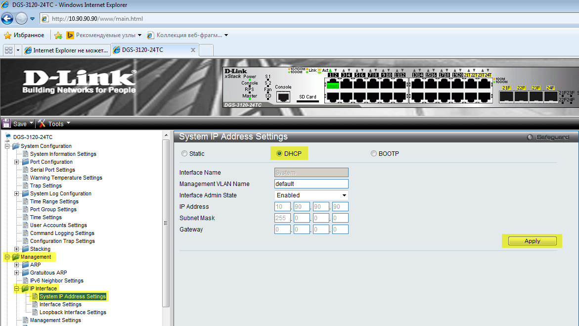 Переходим Managment — IP Interface — System IP Address Settings, отмечаем DHCP и нажимаем Apply.