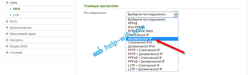 - В появившемся окне выбираем тип соединения — в зависимости от вашего провайдера. В большинстве случаев это DHCP, который предполагает автоматическое получение адреса.
