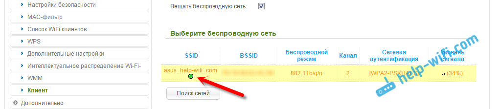- Дальше, в списке ниже выделяем свою Wi-Fi сеть, к которой роутер должен подключиться и получать интернет.