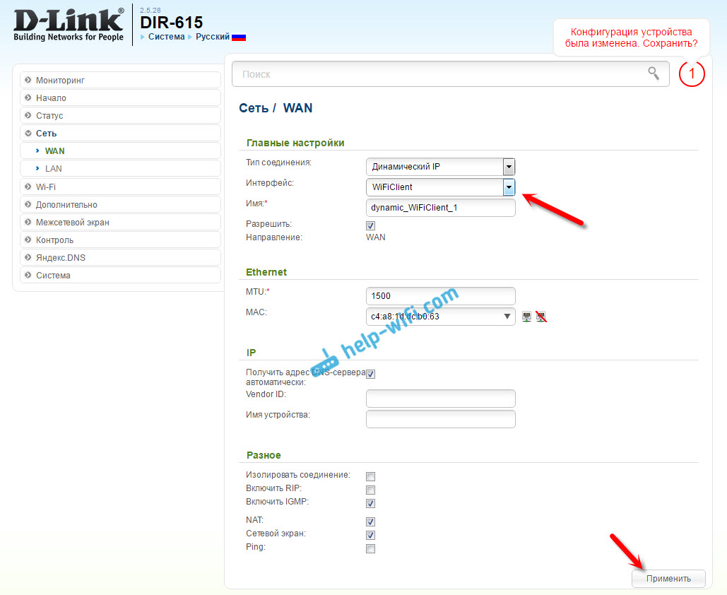 Нам нужно только в списке «Интерфейс» выбрать «WiFiClient». Нажмите на кнопку «Применить».