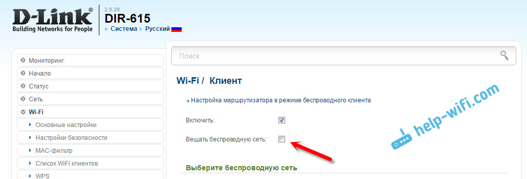 По сути, режим «Клиент», это и есть режим адаптера. Ведь роутер по Wi-Fi подключается к другому роутеру, и передает интернет по сетевому кабелю. Настраиваем все точно так же, как я показывал в первом разделе этой статьи. Только, если вам не нужен интернет по Wi-Fi от второго маршрутизатора, а только по кабелю, то в процессе настройки уберите галочку с пункта «Вещать беспроводную сеть».