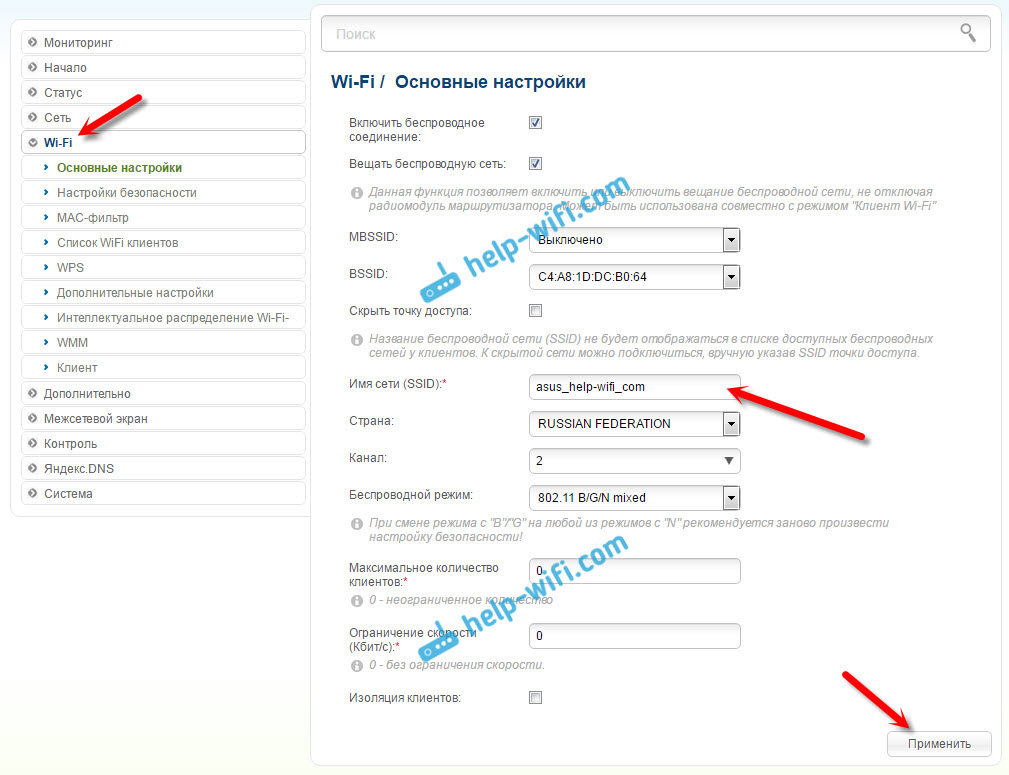 Для этого откройте вкладку «Wi-Fi». В поле «Имя сети (SSID)» нужно прописать название сети точно такое, как на роутере, Wi-Fi сеть которого вы хотите усилить, и к которому подключили D-LINK.