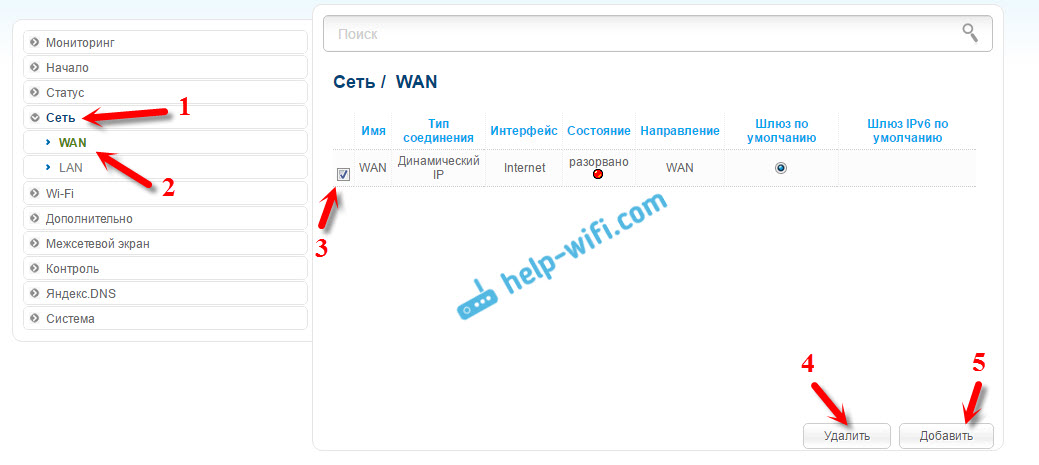 Дальше, переходим на вкладку «Сеть» – «WAN». Выделяем подключения, которые у вас там есть, и нажимаем кнопку «Удалить».