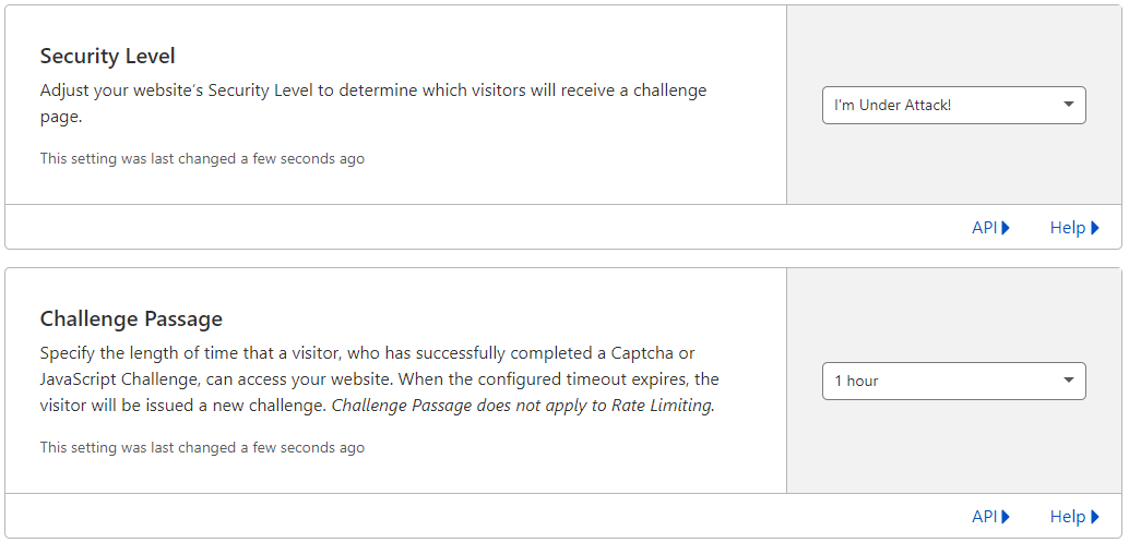 Когда на вас идет атака, то вам необходимо включить режим «Under Attack Mode» в разделе «Overview» или «Firewall» → «Settings». Cloudflare в этом режиме выполняет дополнительные проверки безопасности для всех посетителей сайта, чтобы помочь смягчить DDoS-атаки 7 уровня (HTTP-флуд, TCP-флуд, UDP-флуд и другие).