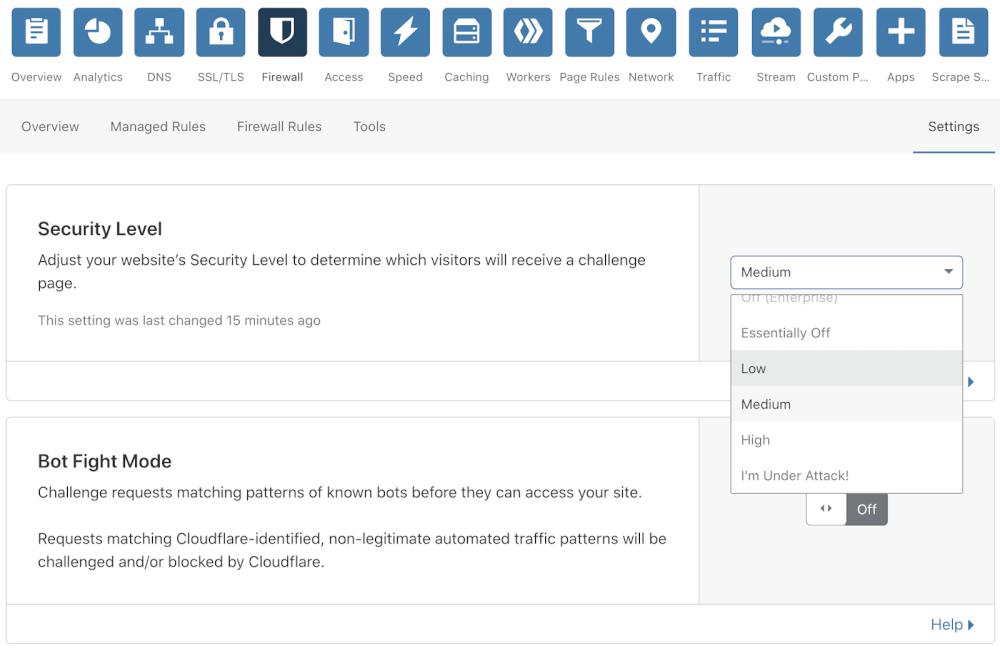 Cloudflare позволяет настроить автоматическую проверку трафика, чтобы защищаться от плохих посетителей. Для этого нужно настроить «Security Level» в разделе «Firewall» → «Settings». Выбранный вами уровень определит, какие посетители должны будут пройти дополнительную проверку перед входом: