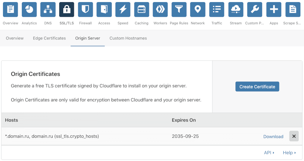 Создайте бесплатный сертификат Cloudflare Origin в разделе «SSL/TLS» → «Origin Server». Для этого нажмите «Create Certificate», выберите срок действия и нажмите кнопку «Next». После этого будет сгенерирован сертификат (Origin Certificate) и приватный ключ (Private key).