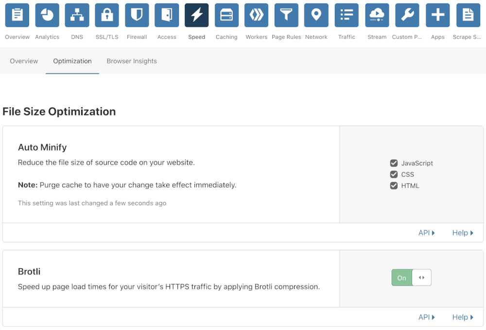 В разделе «Speed» → «Optimization» вы можете ускорить загрузку сайта благодаря нескольким настройкам: