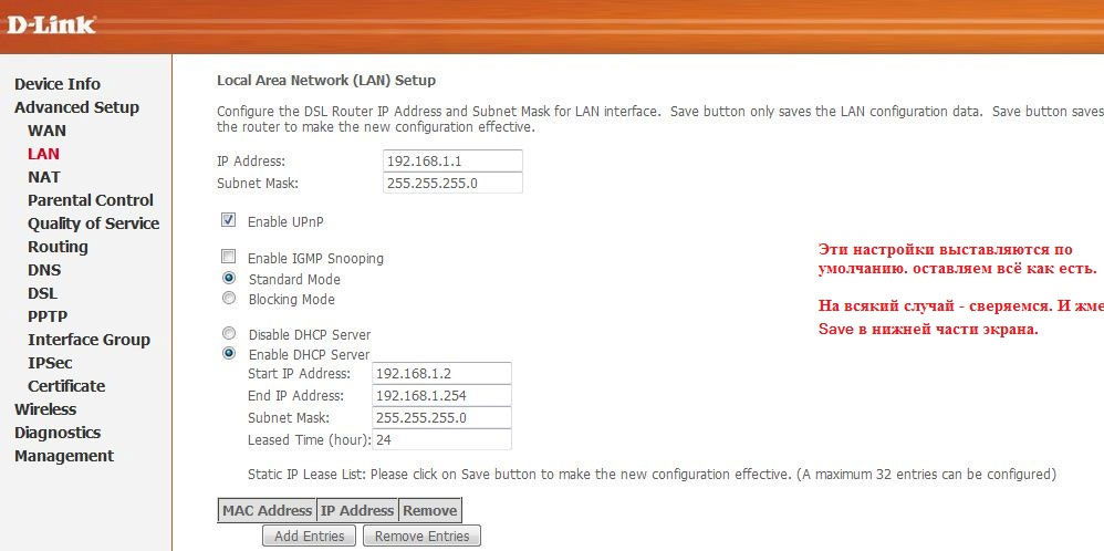 На этой вкладке Вы можете сменить IP-адрес модема и, соответственно, всю присоединённую подсеть, отключить при необходимости DHCP-сервер и активировать UPnP. В принципе можно всё оставить по умолчанию — для непродвинутого пользователя это будет наиболее оптимальный вариант. Если Вы планируете активно пользоваться файлообменными сетями, то я бы советовал активировать UPnP поставить соответствующую галочку. Нажимаем «Save».