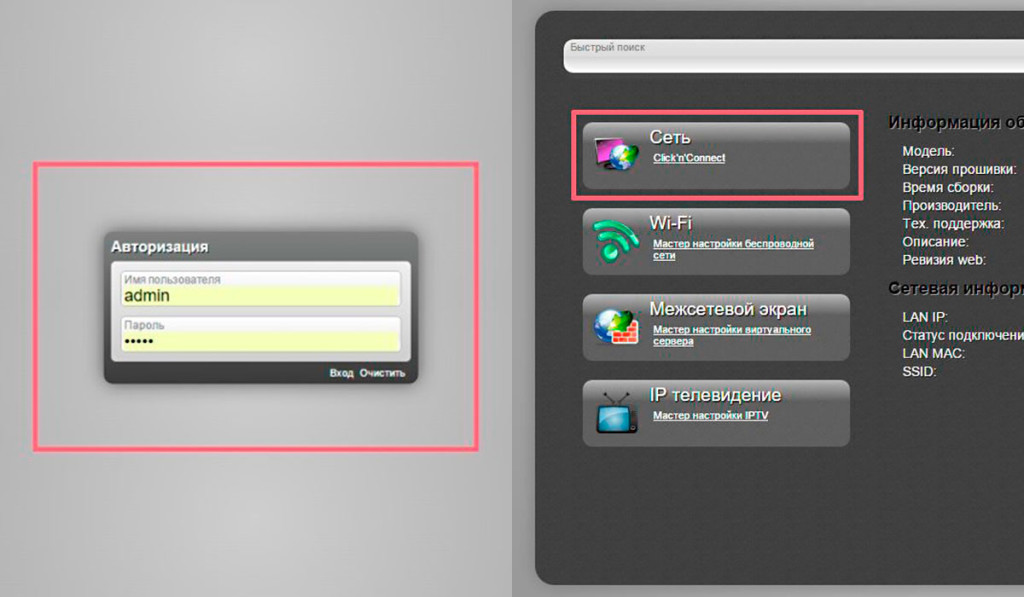 Далее, необходимо обратить внимание на первую вкладку «Сеть». Здесь будет доступен вариант быстрой настройки D-Link DSL 2600u