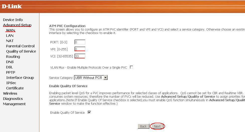 В поля «VPI» и «VCI» указываем параметры канала, в случае Ростелеком (Волгателеком) эти значения: 0 и 33 соответственно. «Service Category» ставим «UBR». Если у Вас очень длинная или старая линия, то для повышения качества связи, я бы советовал активировать QoS, поставим галочку в поле «Enable Quality of Service». Нажимаем кнопку «Next».
