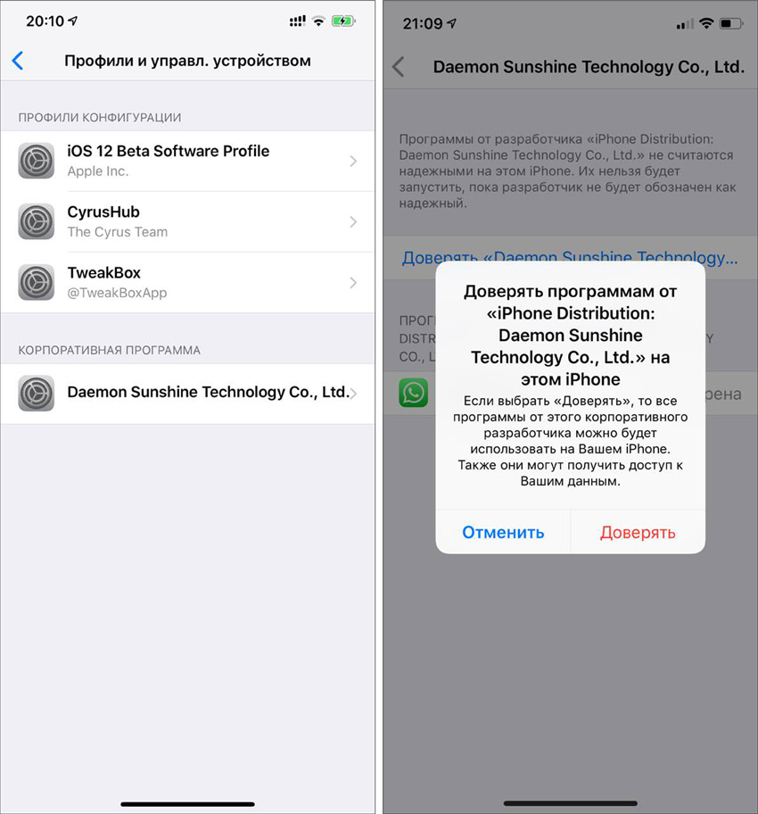 После его установки придется подтвердить использование через меню «Настройки» > «Основные» > «Профили и управл. устройством»: