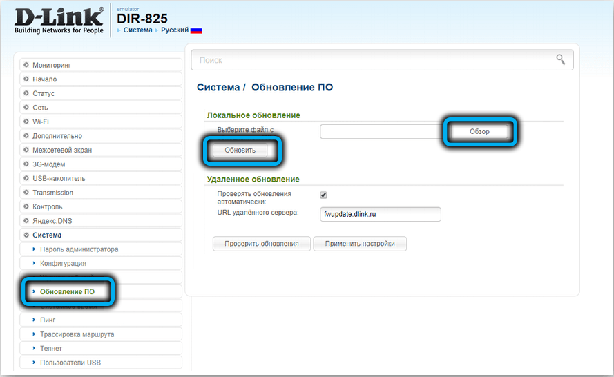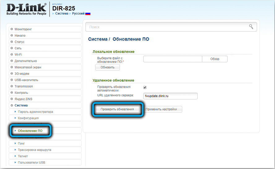 Немногие роутеры из этой ценовой категории умеют обновлять прошивку по воздуху, но у D-Link DIR-825 такая возможность имеется. Соответствующая функция доступна во вкладке «Система» в разделе «Обновление ПО». Вам следует более-менее регулярно заходить сюда и нажимать кнопку «Проверить обновления» – если на сервере производителя будет обнаружена свежая прошивка, обновление будет выполнено автоматически.