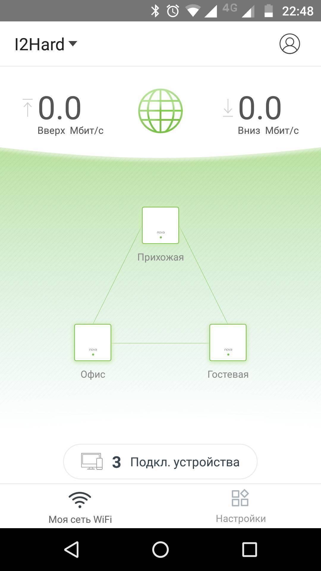 Главный экран приложения отображает скорость загрузки/выгрузки, состояния всех блоков и количество подключенных клиентов.