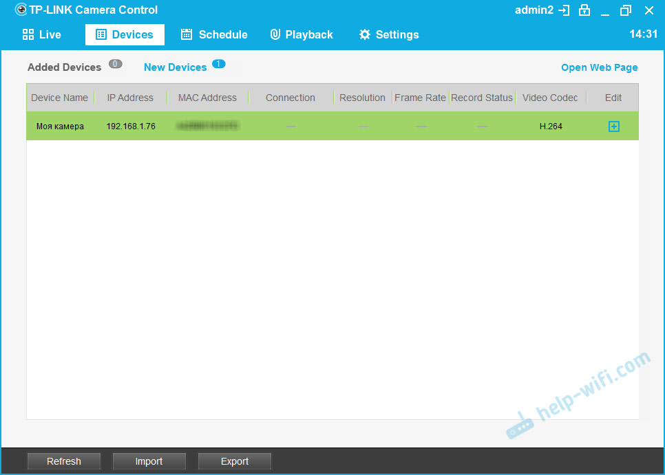 В этой программе так же можно увидеть IP-адрес камеры, по которому можно зайти в панель управления через браузер. В моем случае, адрес 192.168.1.76. Так же этот адрес можно посмотреть в списке клиентов (или DHCP) в настройках маршрутизатора, к которому подключена камера.