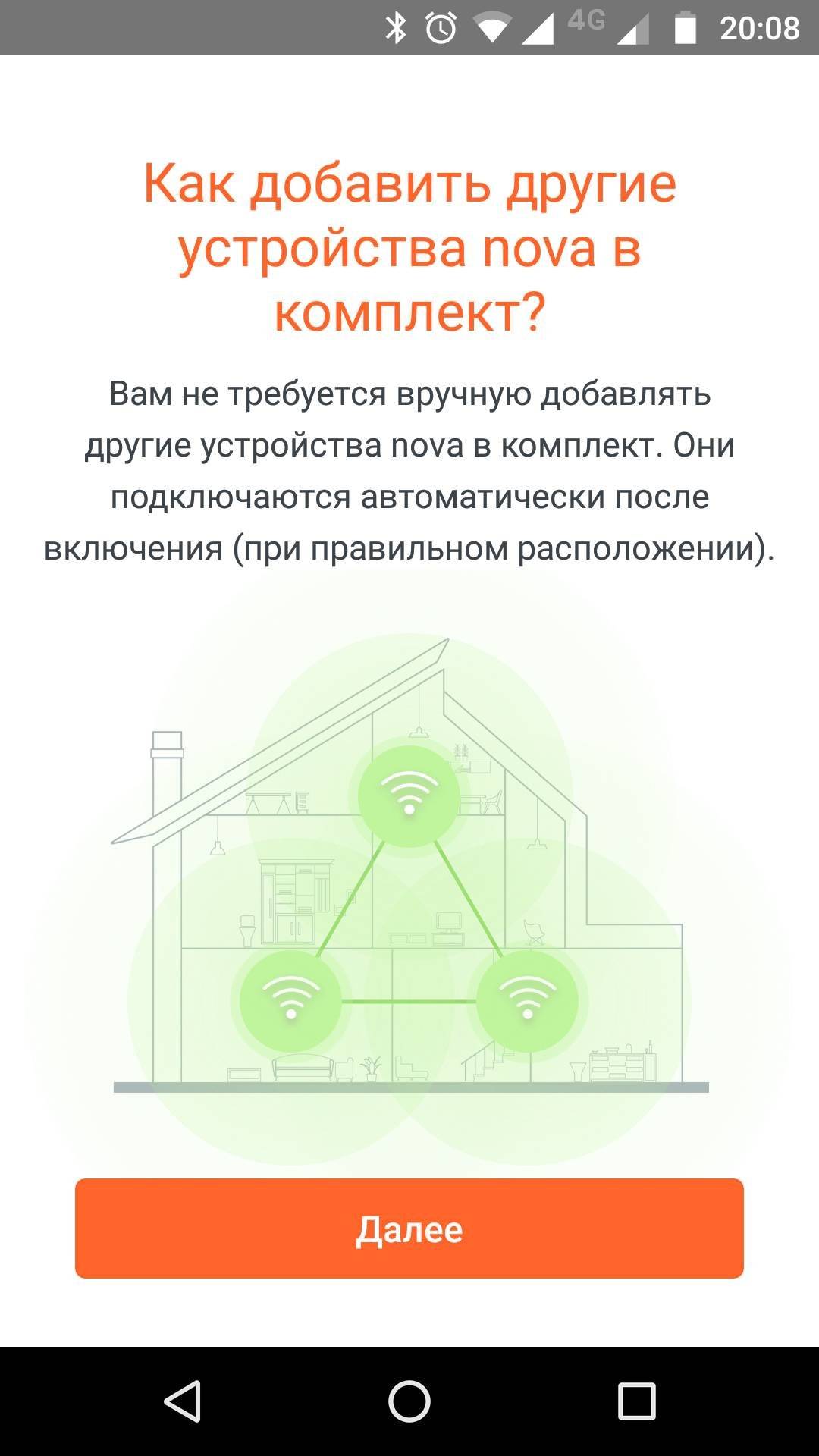 Для начала работы выберите любой блок и подключите к нему питание и кабель от провайдера в порт WAN. Затем на мобильном устройстве подключитесь к сети “nova_xxxx”, используя пароль, изображённый на этикетке внизу роутера. После успешного подключения к сети можно запускать фирменное приложение. При первом запуске в приложении запускается помощник настройки mesh-системы.
