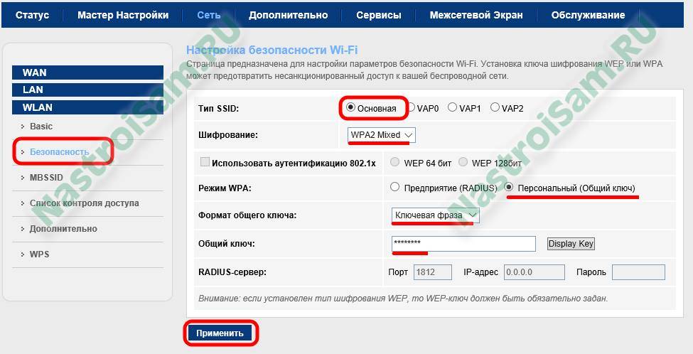 Здесь надо в поле Тип SSID поставить флажок «Основная». Тип шифрования ставим «WPA2 Mixed». Режим работы WPA — «Персональный (Общий ключ)» с форматом «Ключевая фраза». Остаётся только в поле «Общий ключ» ввести пароль на WiFi. В этом качестве можно использовать любую последовательность цифр или букв латинского алфавита не короче 8 символов. Применяем настройки.