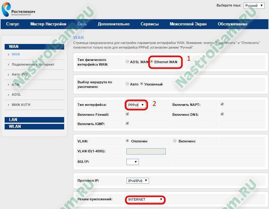 Выбираем режим, в котором у нас будет работать Интернет. В большинстве случаев для Ростелеком — это«PPPoE».