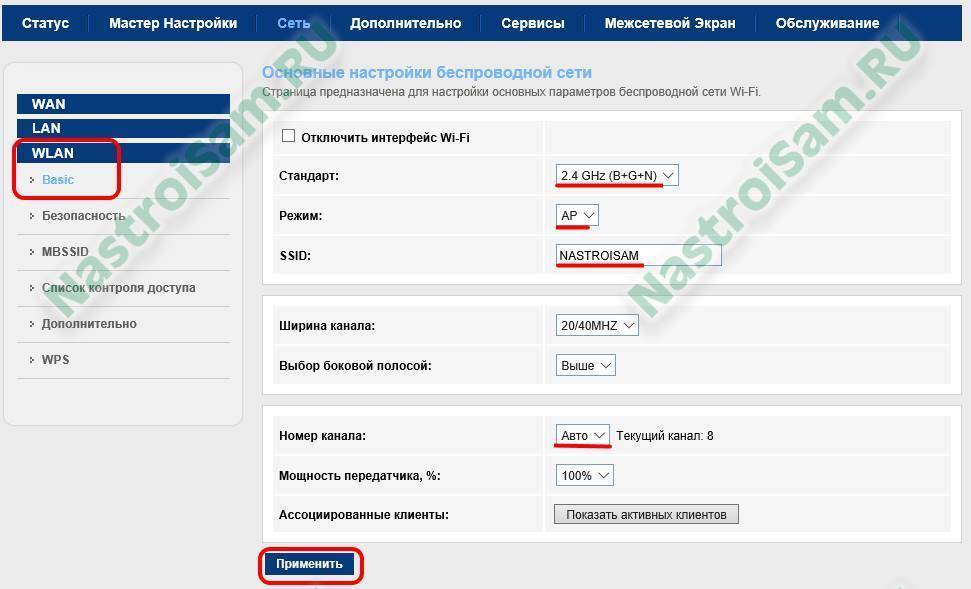 Переходим в раздел «Сеть»->»WLAN»->»Basic»: