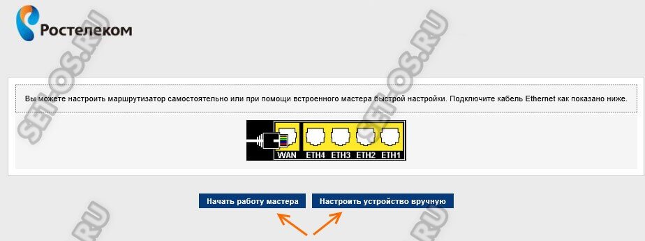 Для удобства как монтёров-установщиков, так и самих абонентов, в веб-интерфейса универсального маршрутизатора встроен Мастер, с помощью которого можно быстро сделать базовую настройку роутера Саджемком Фаст 1744 для Ростелеком, просто ответив на ряд вопросов. Первым делом — надо выбрать вариант настройки: