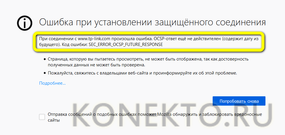 Сертификаты некоторых сайтов привязаны к текущей дате на компьютере пользователя; в этом случае в сообщении «Ваше соединение не защищено» будет содержаться соответствующая информация.