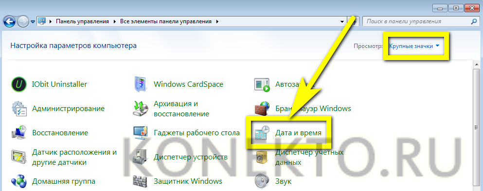Переключиться, если требуется, на «Крупные значки», после чего войти в раздел «Дата и время».