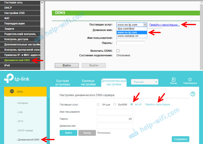 У более дорогих моделей все еще более интересно — совсем недавно TP-Link внедрил облачные технологии, с помощью которых можно заменить DDNS — теперь все настраивается еще проще. Идем во вкладку «Дополнительные настройки», раздел «Сеть — DDNS». Тут можно также использовать существующую учетную запись в no-ip.com
