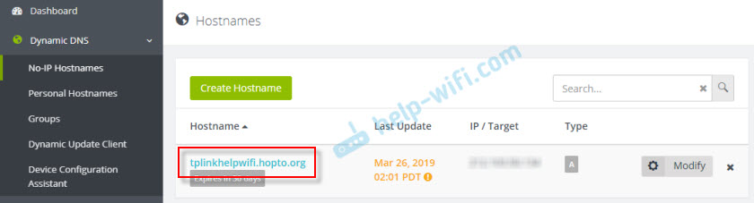 Видим, что адрес зарегистрирован. После настройки роутера, по этому адресу (доменному имени) мы сможем получать доступ к нашему роутеру из интернета (в том числе к FTP-серверу, IP-камерам и т. д.). В моем случае, это адрес tplinkhelpwifi.hopto.org.