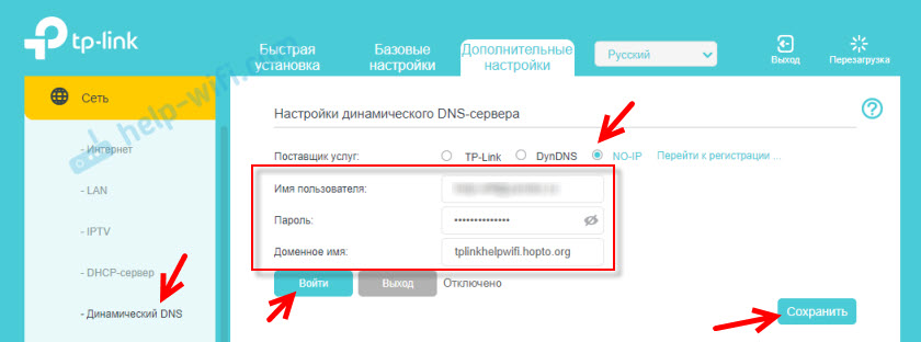 Выбираем поставщика услуг и вводим данные, которые использовали при регистрации на сайте. В том числе доменное имя, которое мы создали для нашего маршрутизатора. Нажимаем на кнопку «Войти». После успешного подключения к DDNS можно сохранить настройки.