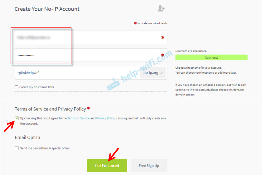 Дальше нужно указать свою почту, придумать и указать пароль (эту почту и пароль мы будем вводить еще в настройках роутера), принять лицензионное соглашение и нажать на кнопку «Get Enhanced».