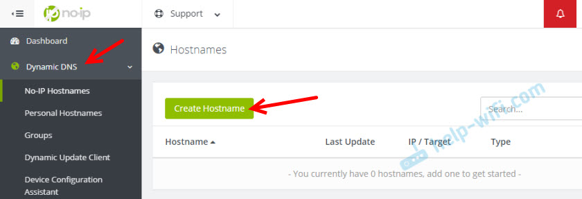 Так как адрес, который я вводил при регистрации почему-то не был создан автоматически, то нужно создать его вручную. Для этого в своем аккаунте переходим в раздел «Dynamic DNS» и нажимаем на кнопку «Create Hostname».