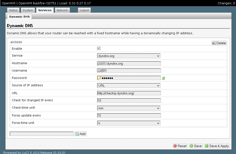 config ‘service’ ‘myddns’ option ‘interface’ ‘wwan’ option ‘service_name’ ‘dyndns.org’ option ‘force_interval’ ’72’ option ‘force_unit’ ‘hours’ option ‘check_interval’ ’10’ option ‘check_unit’ ‘minutes’ option ‘enabled’ ‘1’ option ‘domain’ ‘mysite.dyndns.org’ option ‘username’ ‘login_name’ option ‘password’ ‘dyndns’ option ‘ip_source’ ‘web’ option ‘ip_url’ ‘http://checkip.dyndns.org/’